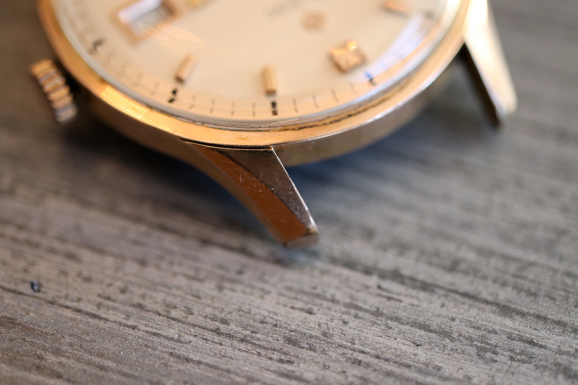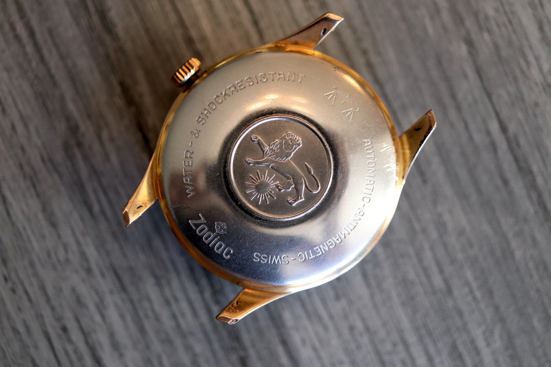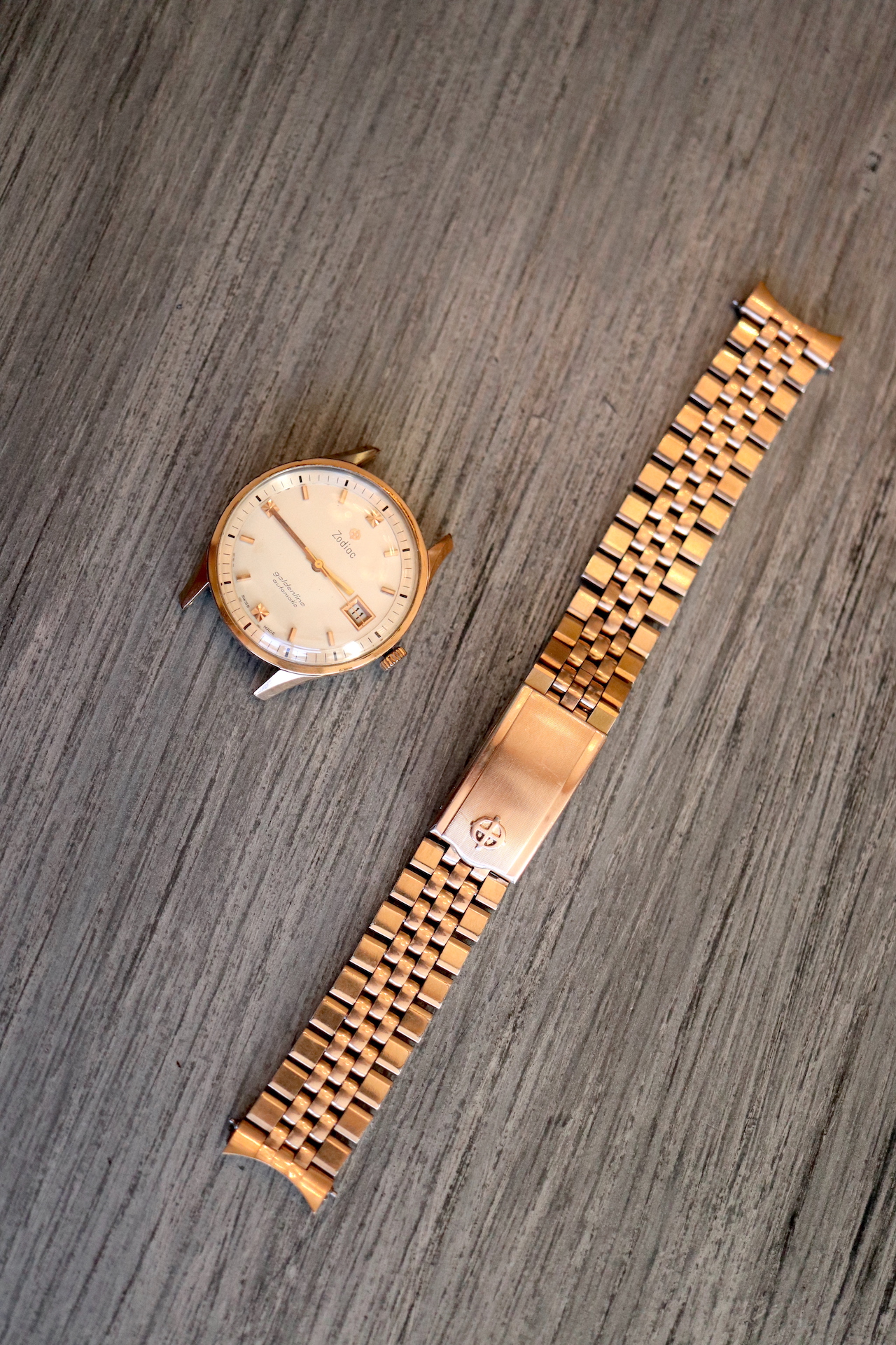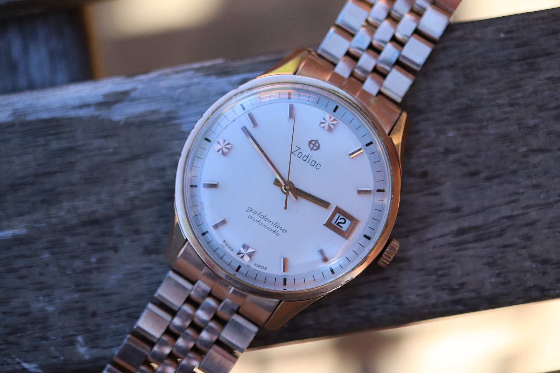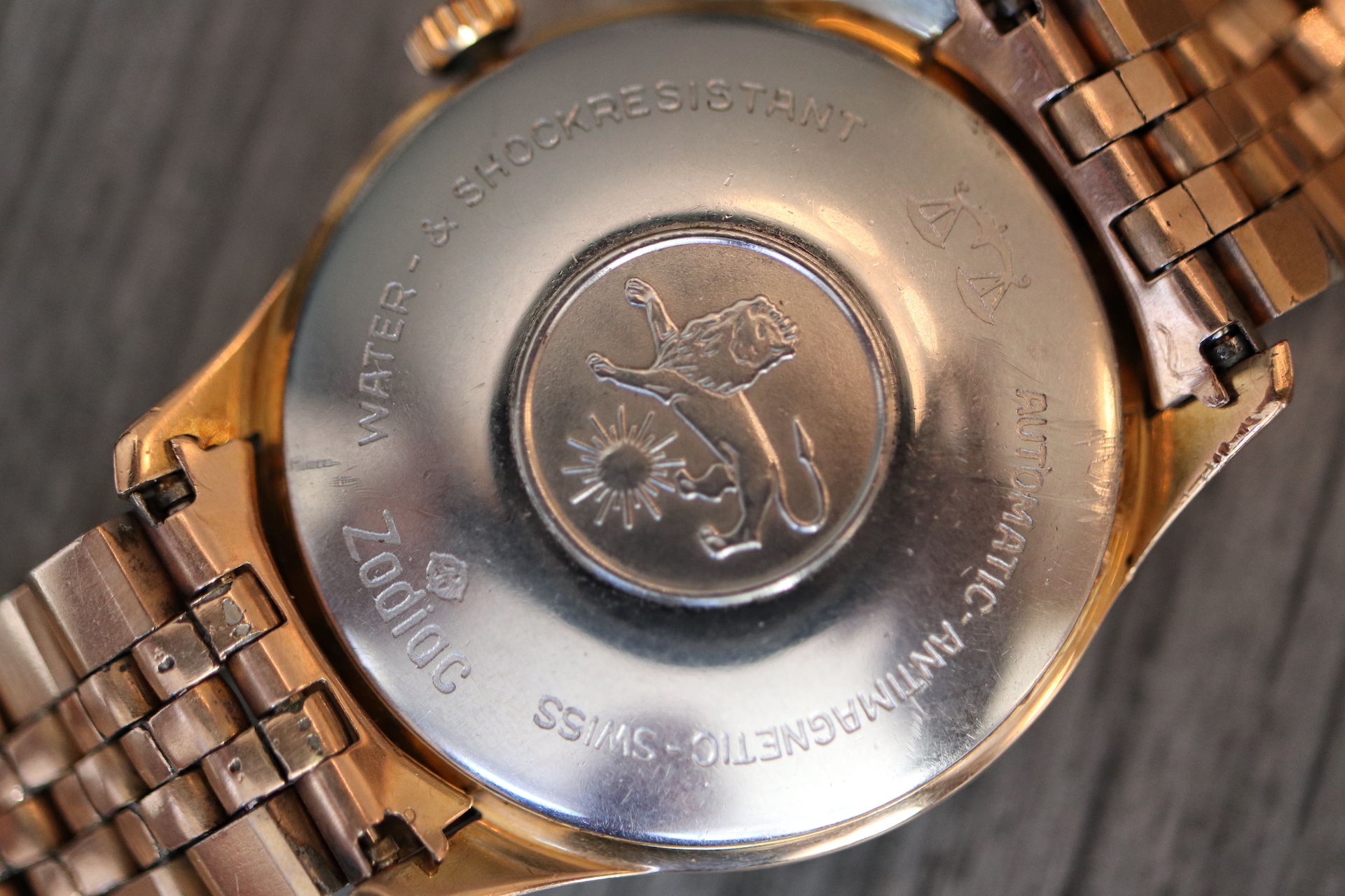 ·For sale, I have a Zodiac Goldenline Ref: 722 924 It has the Caliber 70 which is an automatic movement. Rose gold in color. Case measure 36mm without the crown. There are some scuffs and dents all around and some blemishes on the dial between 6 to 8. I can't open this type of case so unfortunately, I can not provide any movement pictures.