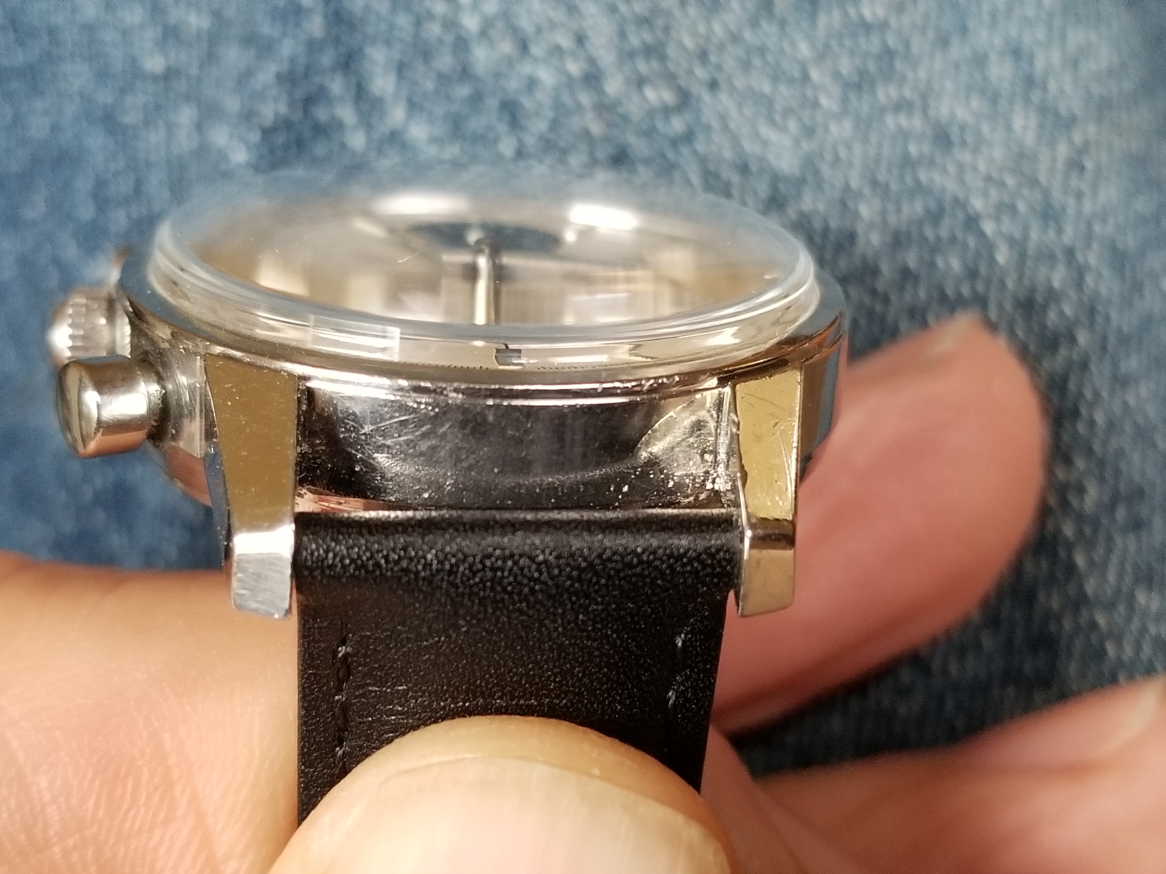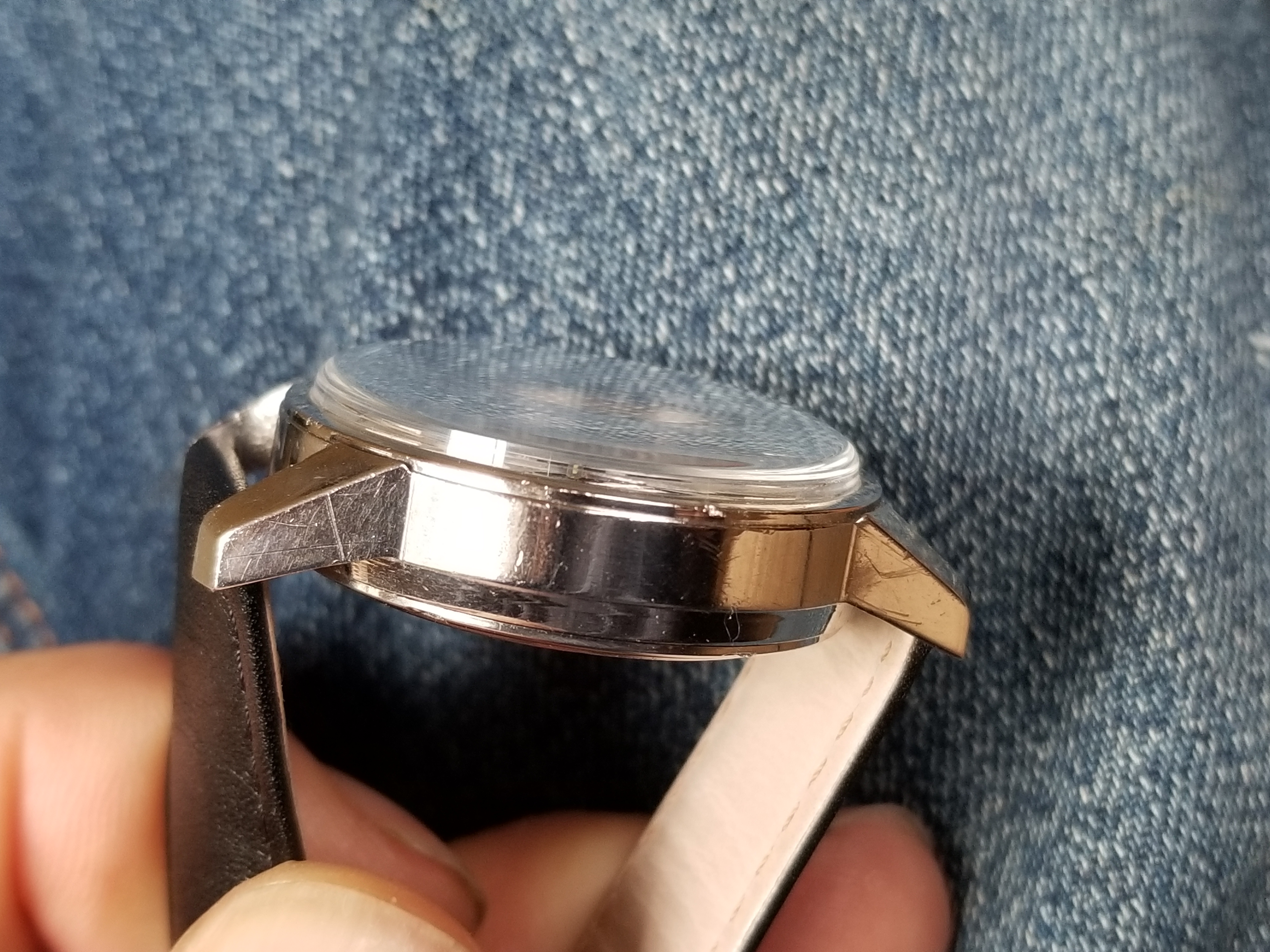 Dial good. Worst of the wear appears in outer black minute track about between 9 and 12 that has a thin scratch through the track. Hands and index markers appear clean and unblemished.