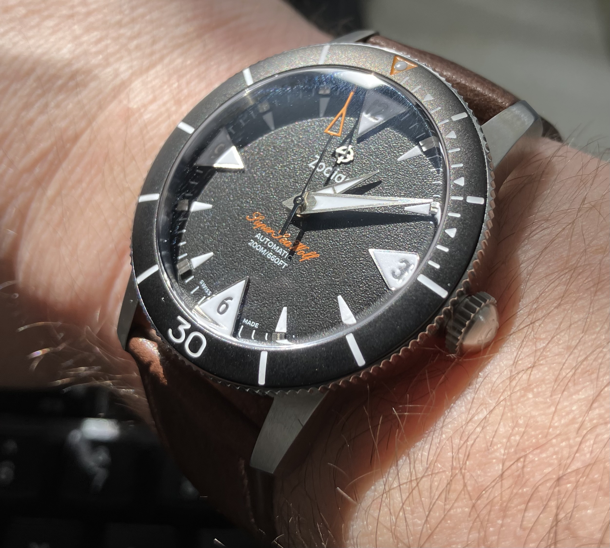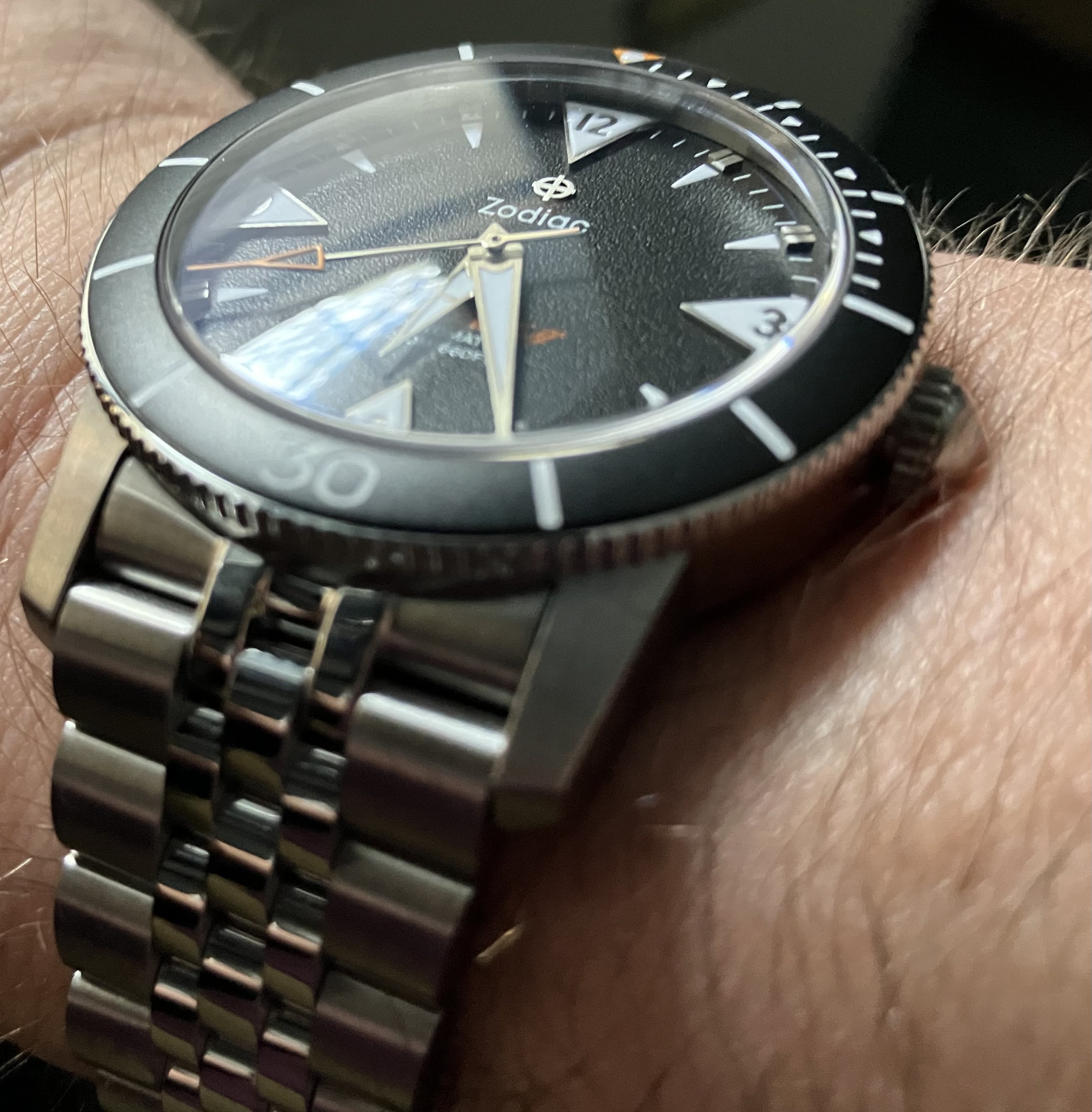 ·After months of dithering (looking at Seikos and Orises, and even flirting with some preowned Omegas and Tudors, as well as other watches from Zodiac), I landed on this Super Sea Wolf 53. (See full specs, etc here.) Wanted something in the 1k to 1500 price-point for when I don't want to or shouldn't wear my AT.