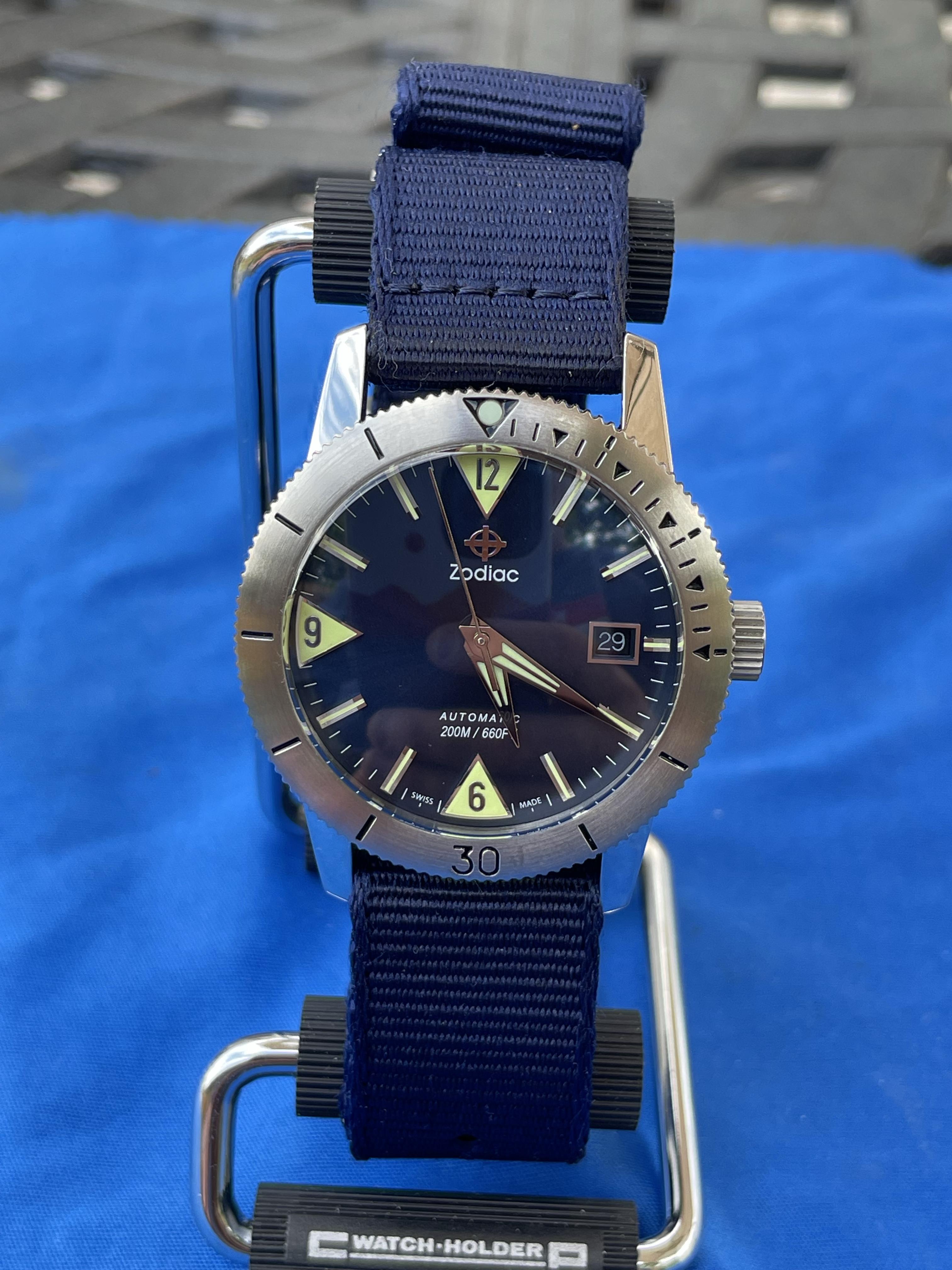 ·Blue dial Zodiac Sea Wolf - Ref. ZO9204. It comes with inner/outer boxes, hang tag and instruction manual. I also upgraded the movement in 2018 to an ETA 2824 through a local watchmaker and the original STP 1-11 Fossil movement is included in the sale. The movement was upgraded because there was an issue setting the time forward - worked backwards, but not forward. The watchmaker fixed the STP movement in it twice and it happened a third time, so it seemed smarter to just do the movement swap. It’s run just fine since the movement swap.