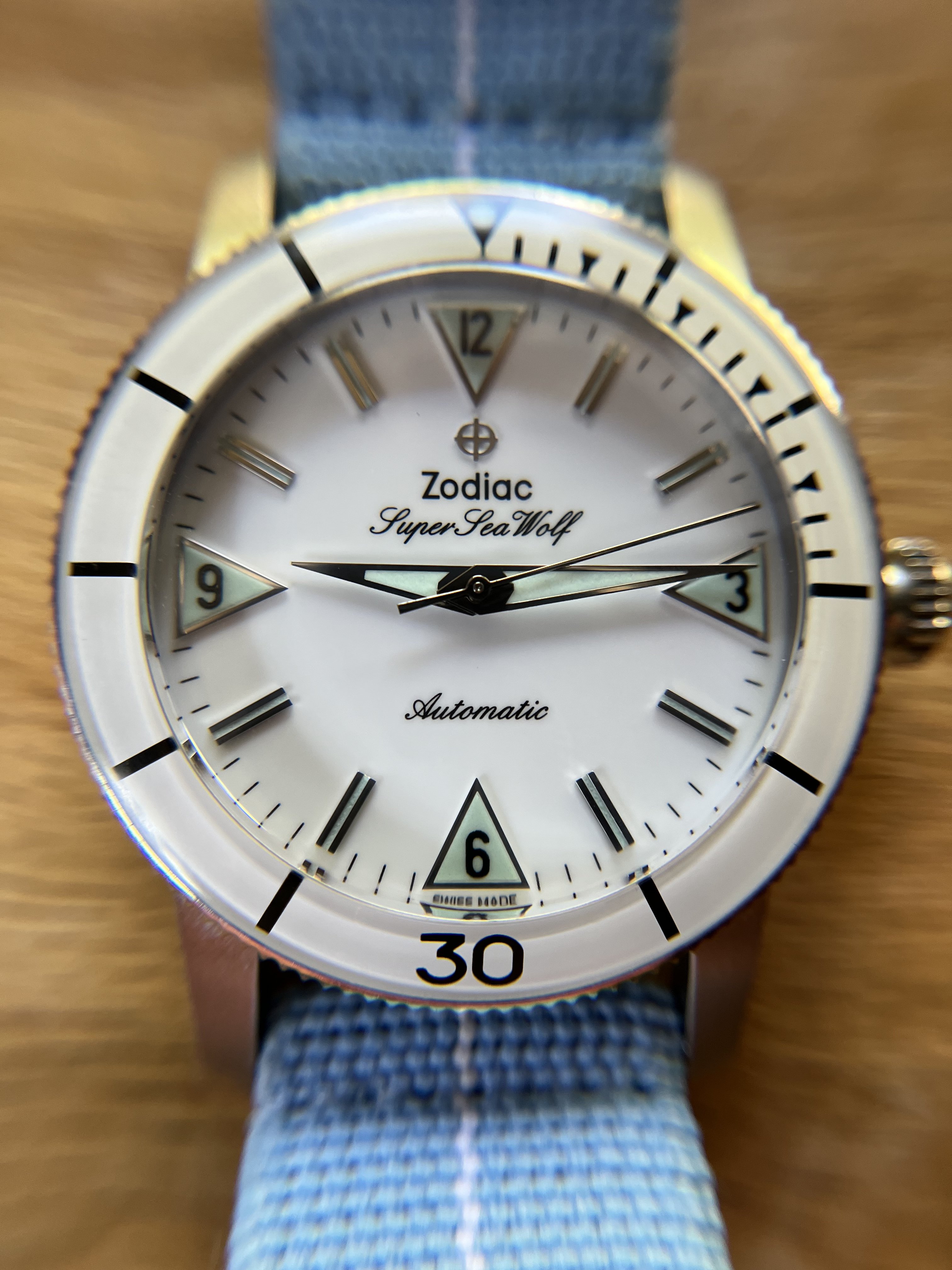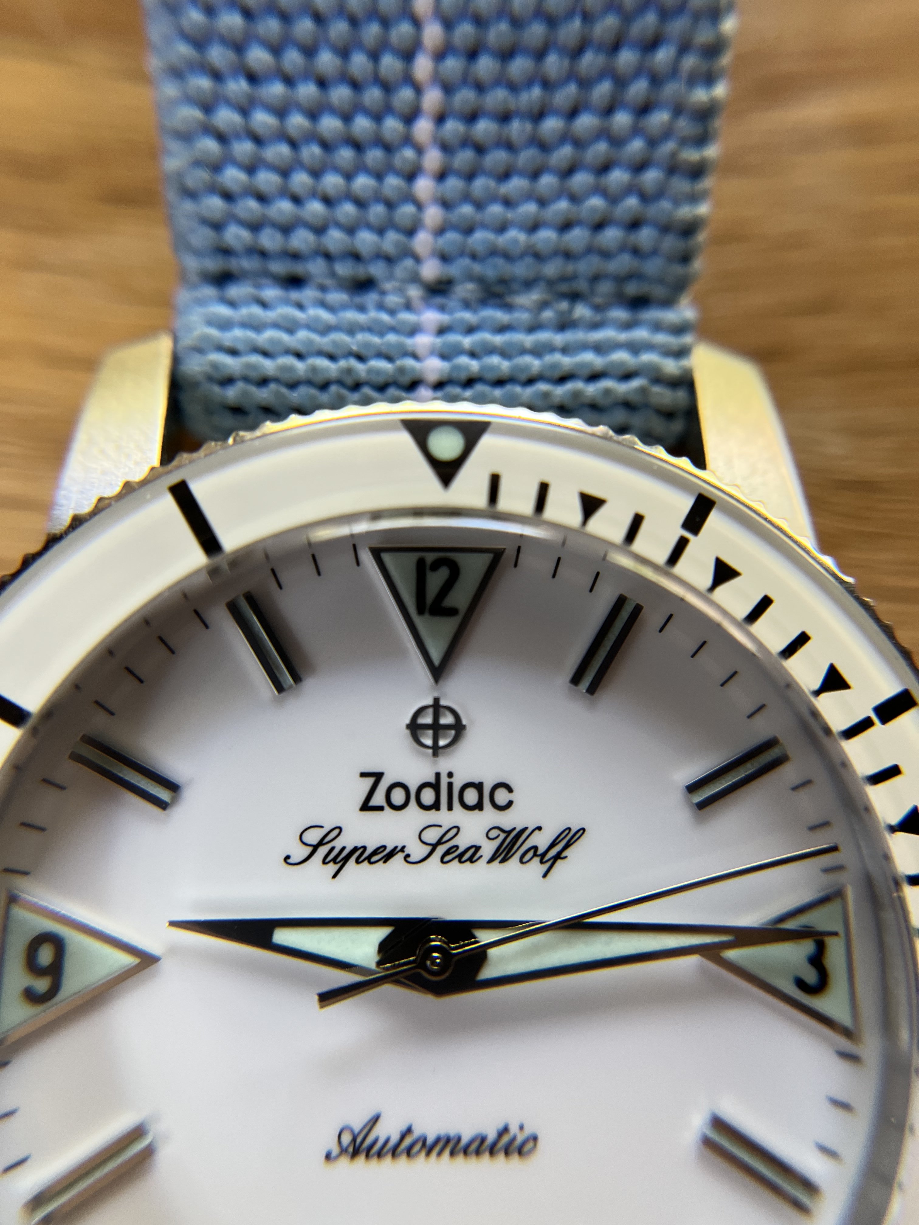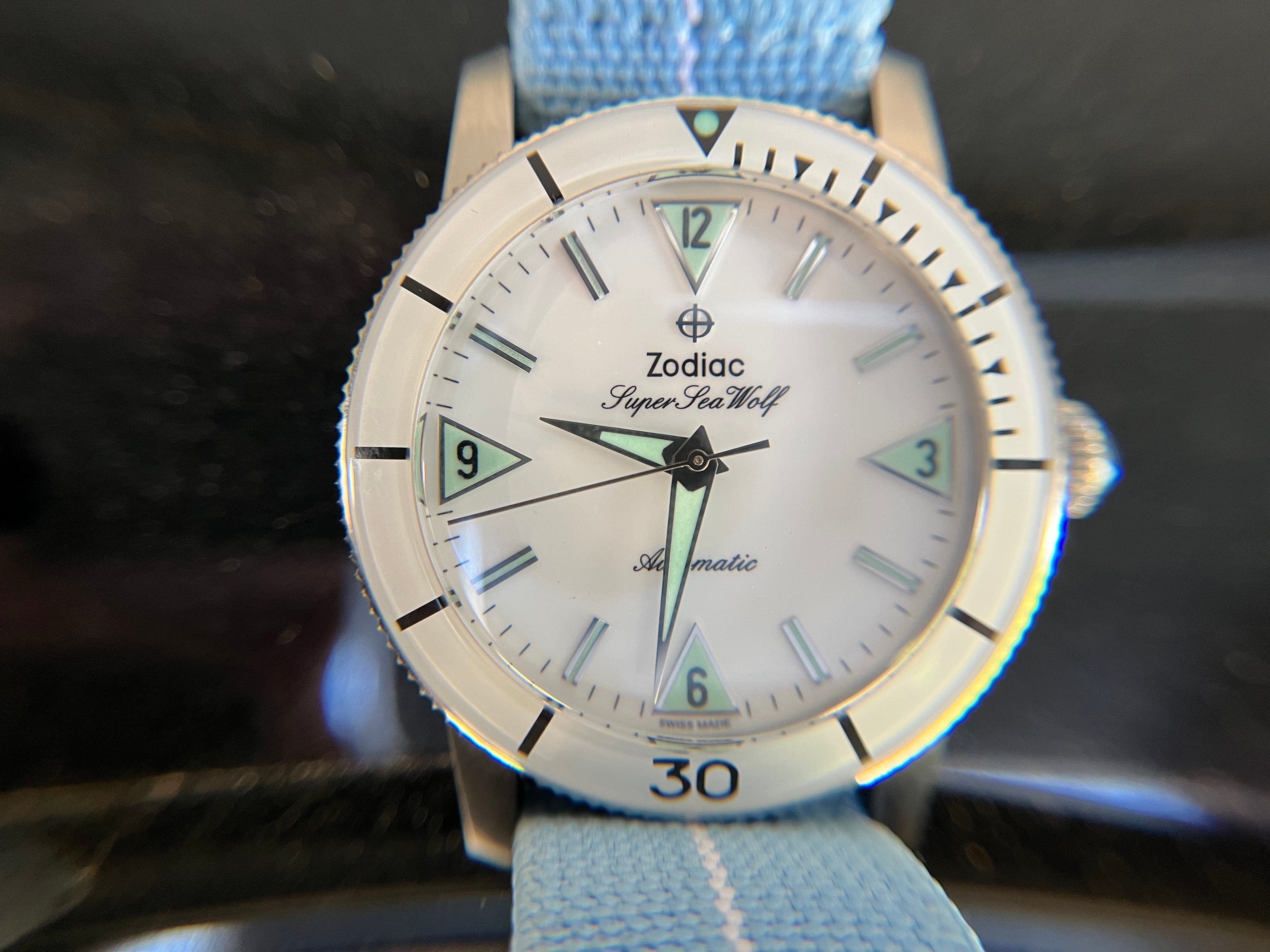 ·For sale is my lovely Zodiac Super Sea Wolf. The white dial and bezel insert make for a great summer watch.
