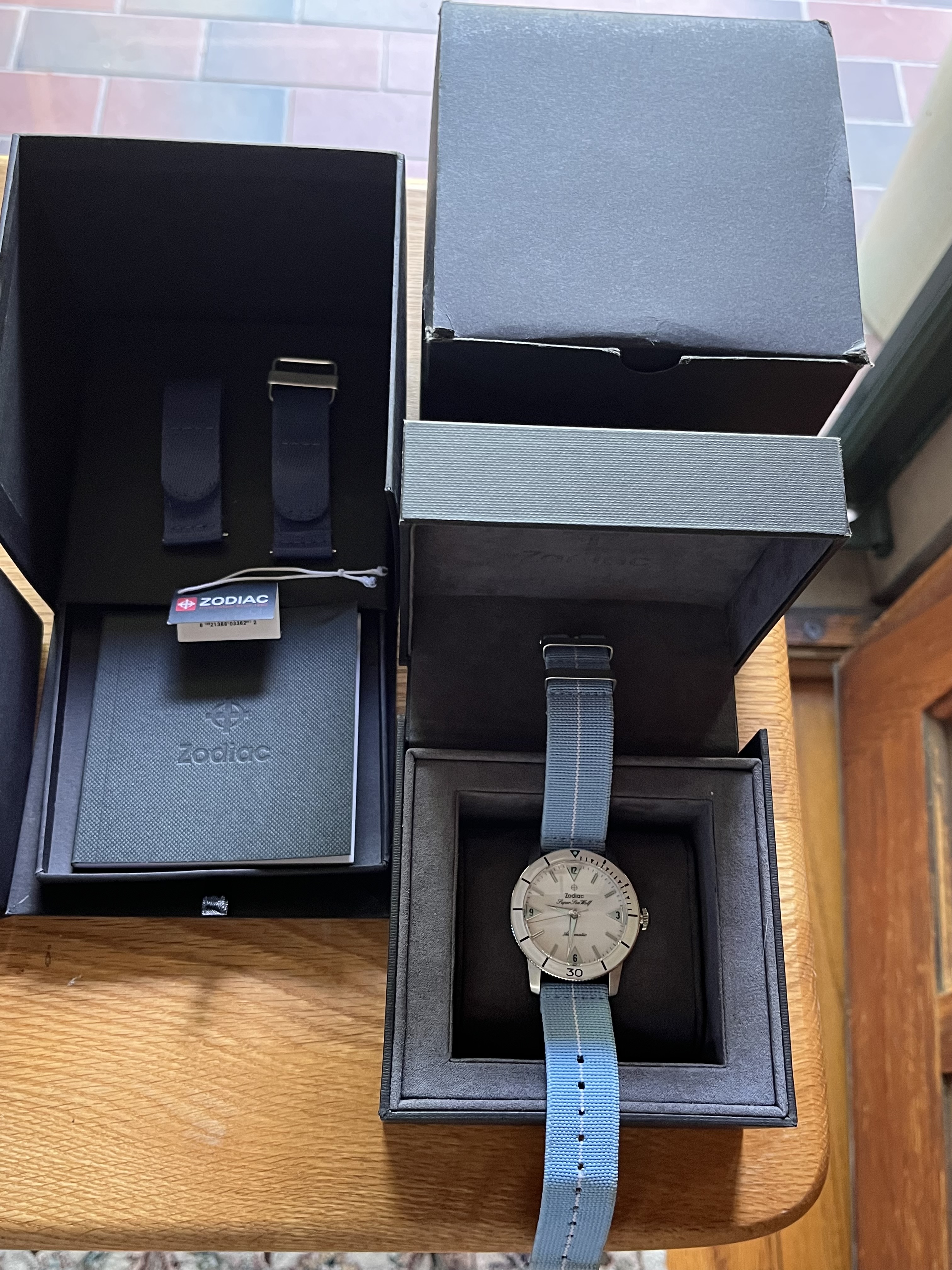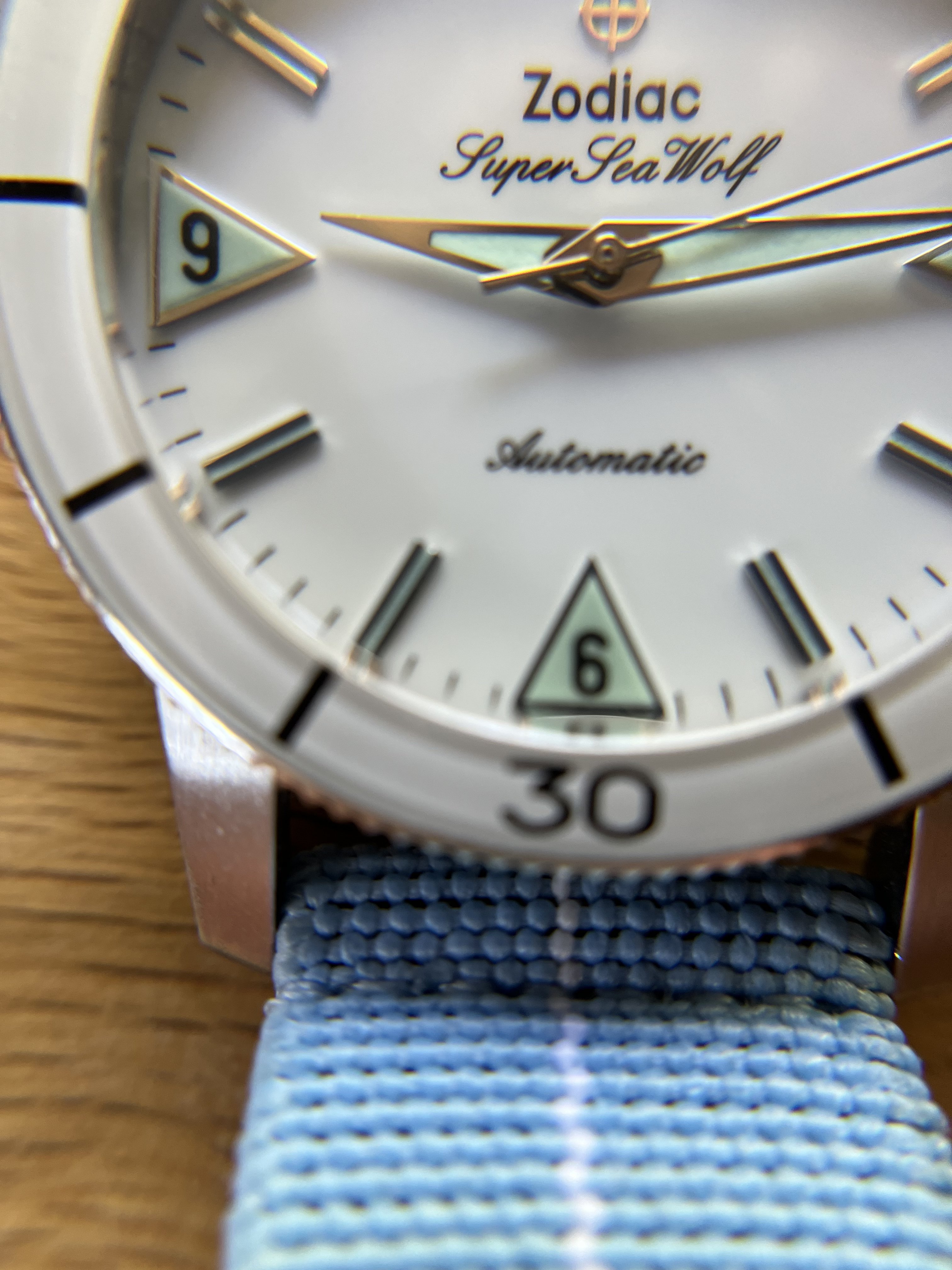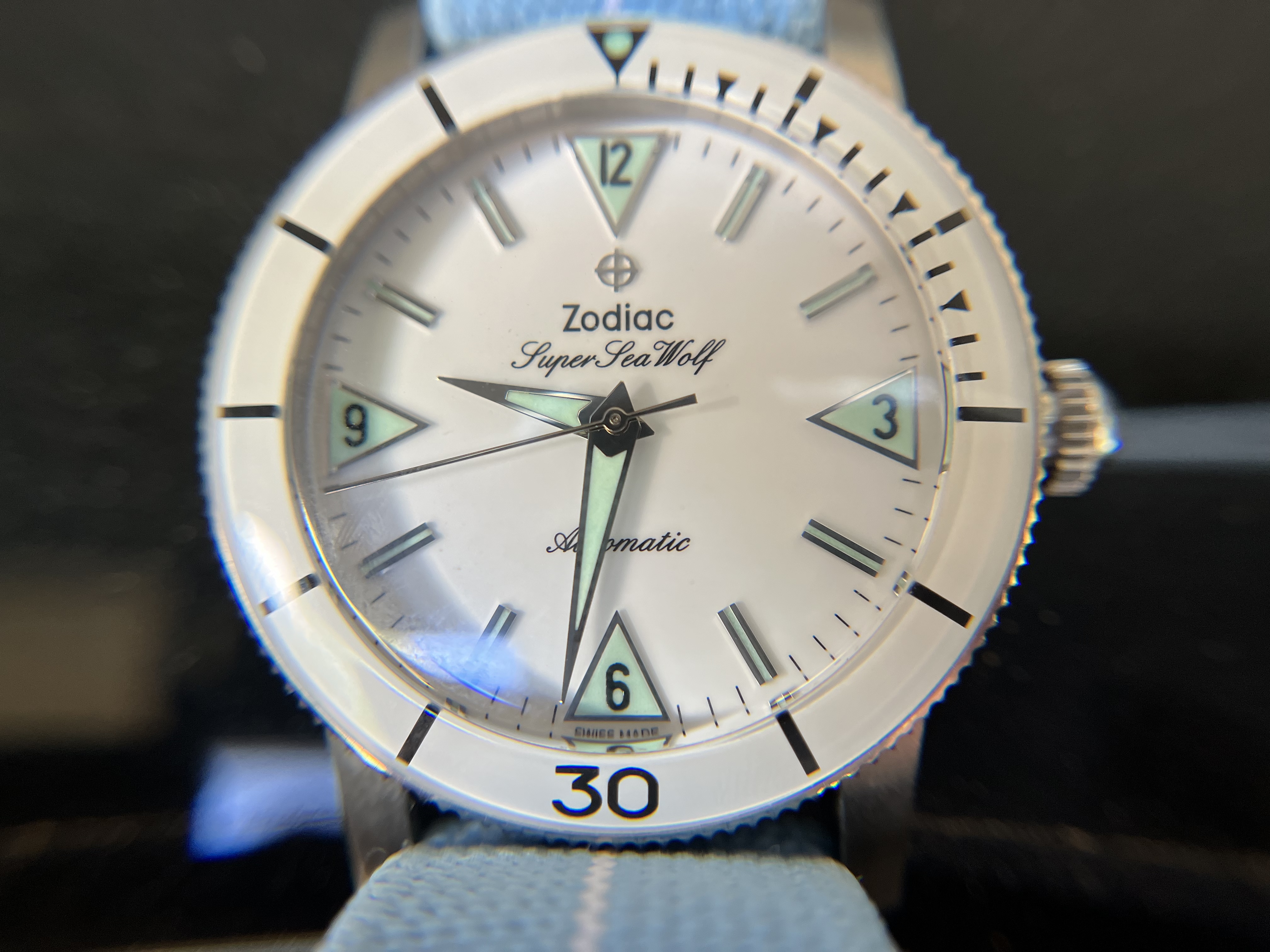 ·For sale is my lovely Zodiac Super Sea Wolf. The white dial and bezel insert make for a great summer watch.